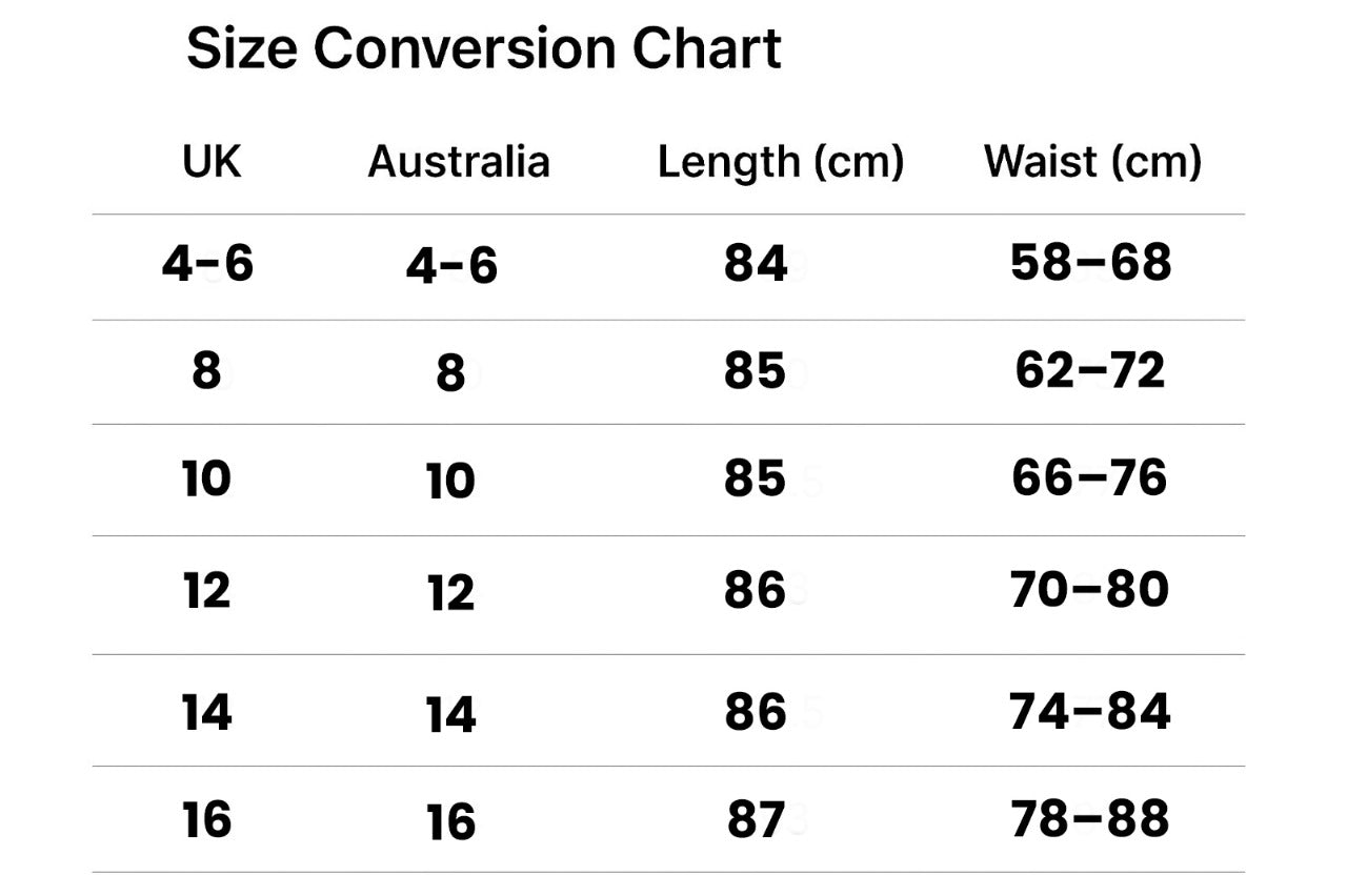 The skirt fits true to size and sits at the natural waist. Check our size guide for waist, hip, and length measurements in cm and inches.